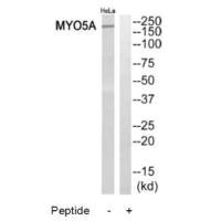 • Western blot analysis of extracts from HeLa cells, using MYO5A antibody.