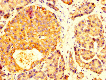 • IHC image of CSB-PA859950LA01HU diluted at 1:200 and staining in paraffin-embedded human pancreatic tissue performed on a Leica BondTM system. After dewaxing and hydration, antigen retrieval was mediated by high pressure in a citrate buffer (pH 6.0). Section was blocked with 10% normal goat serum 30min at RT. Then primary antibody (1% BSA) was incubated at 4°C overnight. The primary is detected by a biotinylated secondary antibody and visualized using an HRP conjugated SP system.