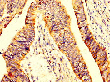 • IHC image of CSB-PA859950LA01HU diluted at 1:200 and staining in paraffin-embedded human colon cancer performed on a Leica BondTM system. After dewaxing and hydration, antigen retrieval was mediated by high pressure in a citrate buffer (pH 6.0). Section was blocked with 10% normal goat serum 30min at RT. Then primary antibody (1% BSA) was incubated at 4°C overnight. The primary is detected by a biotinylated secondary antibody and visualized using an HRP conjugated SP system.