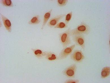 Immunocytochemistry analysis of CSB-PA010100OA04me1HU diluted at 1:5 and staining in Hela cells performed on a Leica BondTM system. The cells were fixed in 4% formaldehyde, permeabilized using 0.2% Triton X-100 and blocked with 10% normal goat serum 30min at RT. Then primary antibody (1% BSA) was incubated at 4°C overnight. The primary is detected by a biotinylated secondary antibody and visualized using an HRP conjugated SP system.