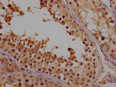 IHC image of CSB-PA615689LA01HU diluted at 1:100 and staining in paraffin-embedded human testis tissue performed on a Leica BondTM system. After dewaxing and hydration, antigen retrieval was mediated by high pressure in a citrate buffer (pH 6.0). Section was blocked with 10% normal goat serum 30min at RT. Then primary antibody (1% BSA) was incubated at 4°C overnight. The primary is detected by a Goat anti-rabbit polymer IgG labeled by HRP and visualized using 0.05% DAB.