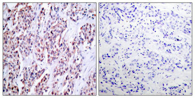 • Immunohistochemical analysis of paraffin-embedded human breast carcinoma tissue using NFkB-p100(Ab-870) Antibody(left) or the same antibody preincubated with blocking peptide(right).