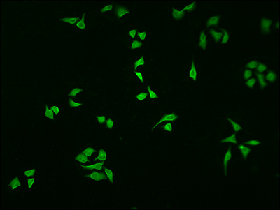 Immunofluorescence staining of HepG2 cells with CSB-PA015761LA01HU at 1:100, counter-stained with DAPI. The cells were fixed in 4% formaldehyde and blocked in 10% normal Goat Serum. The cells were then incubated with the antibody overnight at 4°C. The secondary antibody was Alexa Fluor 488-congugated AffiniPure Goat Anti-Rabbit IgG(H+L).