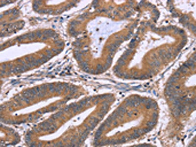 The image on the left is immunohistochemistry of paraffin-embedded Human colon cancer tissue using CSB-PA940332(NRG1 Antibody) at dilution 1/40, on the right is treated with synthetic peptide. (Original magnification: ×200)