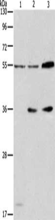 • Gel: 10%SDS-PAGE, Lysate: 40 μg, Lane 1-3: Mouse testis tissue, A172 cells, Jurkat cells, Primary antibody: CSB-PA262646(NRG3 Antibody) at dilution 1/175, Secondary antibody: Goat anti rabbit IgG at 1/8000 dilution, Exposure time: 1 minute
