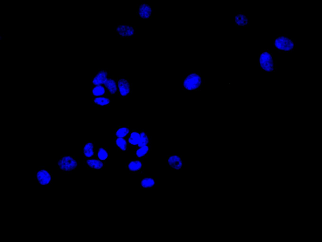 Immunofluorescence staining of MCF-7 cell with 5% goat serum, counter-stained with DAPI. The cells were fixed in 4% formaldehyde and blocked in 10% normal Goat Serum. The cells were then incubated with the antibody overnight at 4C. The secondary antibody was Alexa Fluor 488-congugated AffiniPure Goat Anti-Rabbit IgG(H+L).