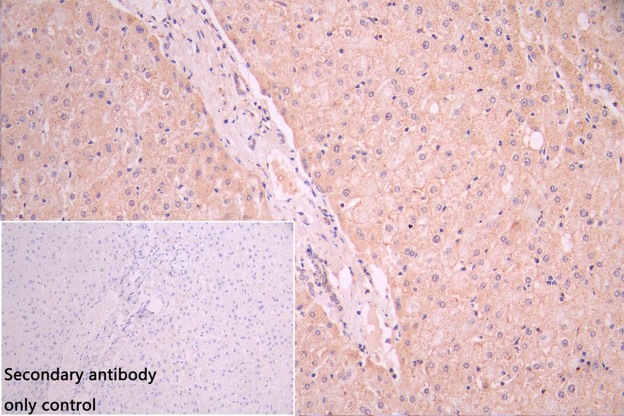 IHC image of CSB-PA017315LA01HU diluted at 1:50 and staining in paraffin-embedded human Liver tissue performed on a Leica BondTM system. After dewaxing and hydration, antigen retrieval was mediated by high pressure in a citrate buffer (pH 6.0). Section was blocked with 10% normal goat serum 30min at RT. Then primary antibody (1% BSA) was incubated at 4°C overnight. The primary is detected by a Goat anti-rabbit polymer IgG labeled by HRP and visualized using 0.05% DAB. Secondary antibody only control: uses 1% BSA instead of primary antibody