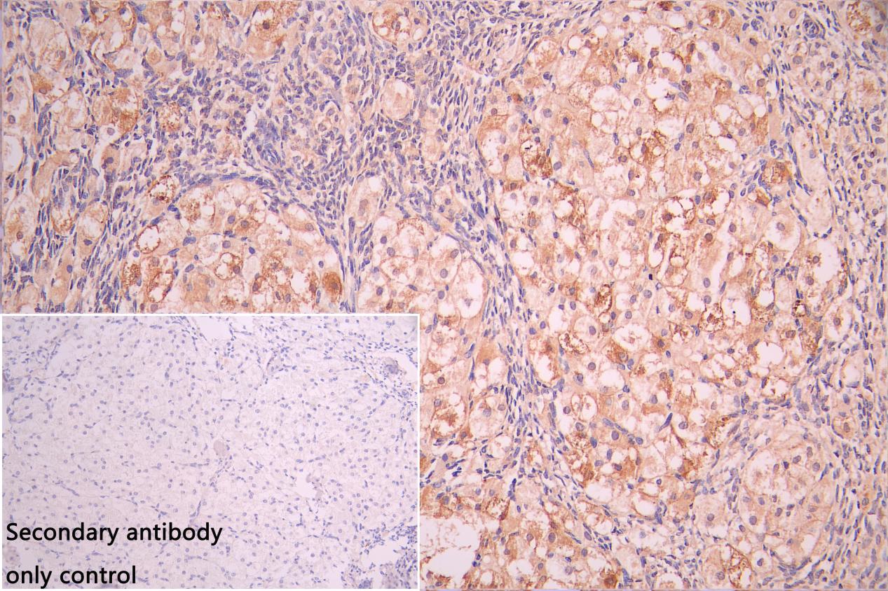 IHC image of CSB-PA017315LA01HU diluted at 1:50 and staining in paraffin-embedded human ovarian tissue performed on a Leica BondTM system. After dewaxing and hydration, antigen retrieval was mediated by high pressure in a citrate buffer (pH 6.0). Section was blocked with 10% normal goat serum 30min at RT. Then primary antibody (1% BSA) was incubated at 4°C overnight. The primary is detected by a Goat anti-rabbit polymer IgG labeled by HRP and visualized using 0.05% DAB. Secondary antibody only control: uses 1% BSA instead of primary antibody