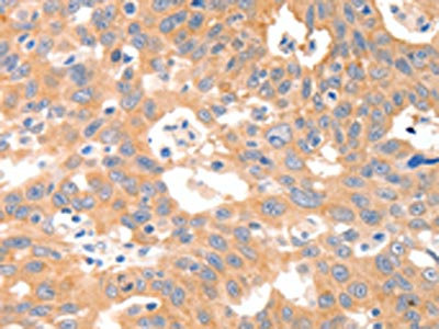 The image on the left is immunohistochemistry of paraffin-embedded Human lung cancer tissue using CSB-PA139014(P2RY11 Antibody) at dilution 1/30, on the right is treated with synthetic peptide. (Original magnification: ×200)