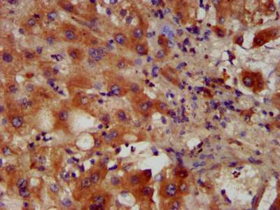• IHC image of CSB-PA017372LA01HU diluted at 1:400 and staining in paraffin-embedded human liver tissue performed on a Leica BondTM system. After dewaxing and hydration, antigen retrieval was mediated by high pressure in a citrate buffer (pH 6.0). Section was blocked with 10% normal goat serum 30min at RT. Then primary antibody (1% BSA) was incubated at 4°C overnight. The primary is detected by a biotinylated secondary antibody and visualized using an HRP conjugated SP system.