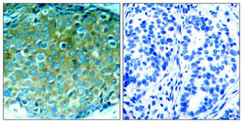 Immunohistochemical analysis of paraffin-embedded human breast carcinoma tissue using PAK1(Ab-212) Antibody(left) or the same antibody preincubated with blocking peptide(right).
