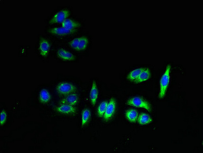• Immunofluorescent analysis of HepG2 cells using CSB-PA768224LA01HU at dilution of 1:100 and Alexa Fluor 488-congugated AffiniPure Goat Anti-Rabbit IgG(H+L)