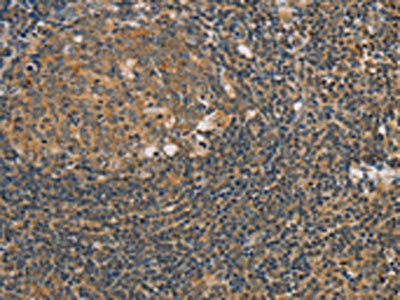 The image on the left is immunohistochemistry of paraffin-embedded Human tonsil tissue using CSB-PA870690(PARP11 Antibody) at dilution 1/20, on the right is treated with fusion protein. (Original magnification: ×200)