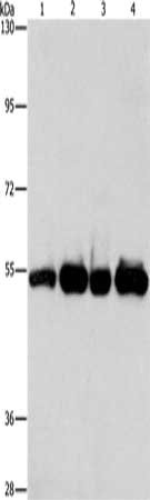 Gel: 8%SDS-PAGE, Lysate: 40 μg, Lane 1-4: Human bladder carcinoma tissue, A172 cells, human fetal brain tissue, hela cells, Primary antibody: CSB-PA781587(PDE4D Antibody) at dilution 1/500, Secondary antibody: Goat anti rabbit IgG at 1/8000 dilution, Exposure time: 10 seconds