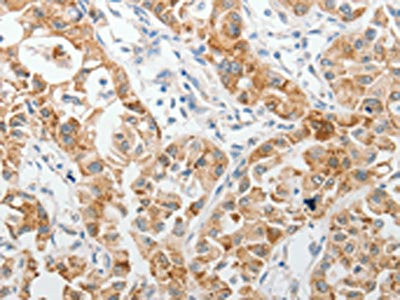 The image on the left is immunohistochemistry of paraffin-embedded Human lung cancer tissue using CSB-PA889657(PIBF1 Antibody) at dilution 1/60, on the right is treated with synthetic peptide. (Original magnification: ×200)