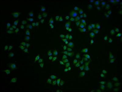 Immunofluorescence staining of Hela cells with CSB-PA845171LA01HU at 1:100, counter-stained with DAPI. The cells were fixed in 4% formaldehyde and blocked in 10% normal Goat Serum. The cells were then incubated with the antibody overnight at 4°C. The secondary antibody was Alexa Fluor 488-congugated AffiniPure Goat Anti-Rabbit IgG(H+L).
