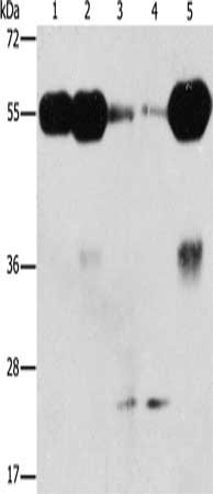 • Gel: 10%SDS-PAGE, Lysate: 40 μg, Lane 1-5: Mouse brain tissue, human fetal brain tissue, mouse testis tissue, hela cells, human fetal kidney tissue, Primary antibody: CSB-PA159945(PIK3R3 Antibody) at dilution 1/250, Secondary antibody: Goat anti rabbit IgG at 1/8000 dilution, Exposure time: 2 minutes