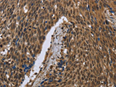 • The image on the left is immunohistochemistry of paraffin-embedded Human cervical cancer tissue using CSB-PA697513(PIP Antibody) at dilution 1/50, on the right is treated with fusion protein. (Original magnification: ×200)