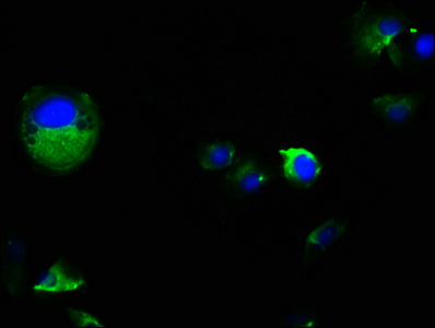 Immunofluorescence staining of MCF-7 cells with CSB-PA618787LA01HU at 1:100, counter-stained with DAPI. The cells were fixed in 4% formaldehyde, permeabilized using 0.2% Triton X-100 and blocked in 10% normal Goat Serum. The cells were then incubated with the antibody overnight at 4°C. The secondary antibody was Alexa Fluor 488-congugated AffiniPure Goat Anti-Rabbit IgG(H+L).