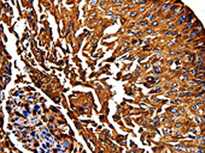 • The image on the left is immunohistochemistry of paraffin-embedded Human lung cancer tissue using CSB-PA057752(PKM Antibody) at dilution 1/50, on the right is treated with fusion protein. (Original magnification: ×200)