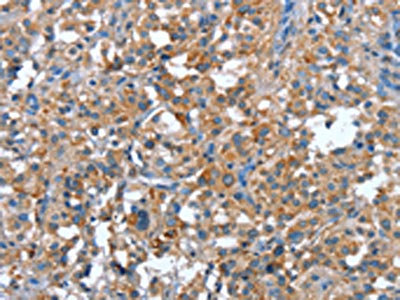 The image on the left is immunohistochemistry of paraffin-embedded Human gastric cancer tissue using CSB-PA202119(PLA2G6 Antibody) at dilution 1/15, on the right is treated with synthetic peptide. (Original magnification: ×200)