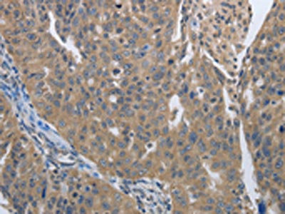 The image on the left is immunohistochemistry of paraffin-embedded Human ovarian cancer tissue using CSB-PA782127(PMS2 Antibody) at dilution 1/50, on the right is treated with synthetic peptide. (Original magnification: ×200)
