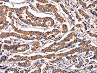 The image on the left is immunohistochemistry of paraffin-embedded Human breast cancer tissue using CSB-PA903914(PPIF Antibody) at dilution 1/60, on the right is treated with fusion protein. (Original magnification: ×200)