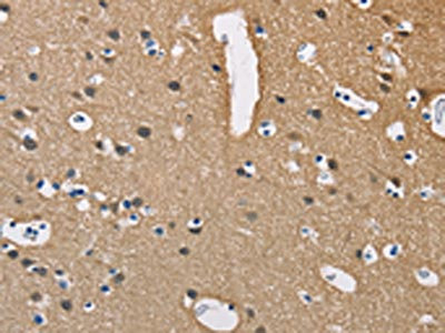 The image on the left is immunohistochemistry of paraffin-embedded Human brain tissue using CSB-PA943107(PPP3CA Antibody) at dilution 1/40, on the right is treated with fusion protein. (Original magnification: ×200)