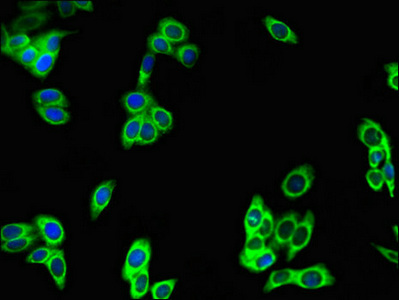 Immunofluorescent analysis of HepG2 cells using CSB-PA741122LA01HU at dilution of 1:100 and Alexa Fluor 488-congugated AffiniPure Goat Anti-Rabbit IgG(H+L)