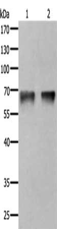 Gel: 10%SDS-PAGE, Lysate: 50 μg, Lane 1-2: Jurkat cells, 293T cells, Primary antibody: CSB-PA566617(PRKCA Antibody) at dilution 1/100, Secondary antibody: Goat anti rabbit IgG at 1/8000 dilution, Exposure time: 40 seconds