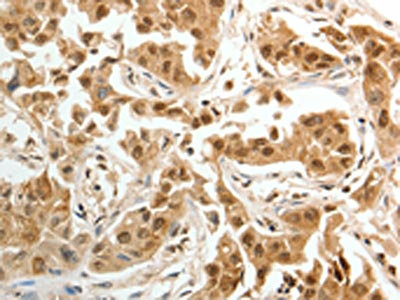 The image on the left is immunohistochemistry of paraffin-embedded Human lung cancer tissue using CSB-PA644570(PSMD14 Antibody) at dilution 1/20, on the right is treated with fusion protein. (Original magnification: ×200)