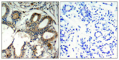 Immunohistochemical analysis of paraffin-embedded human breast carcinoma tissue using SHP-2(Ab-580) Antibody(left) or the same antibody preincubated with blocking peptide(right).