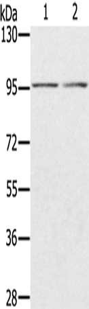 Gel: 6%SDS-PAGE, Lysate: 40 μg, Lane 1-2: PC3 cells, human fetal liver tissue, Primary antibody: CSB-PA185772(PYGL Antibody) at dilution 1/300, Secondary antibody: Goat anti rabbit IgG at 1/8000 dilution, Exposure time: 30 seconds