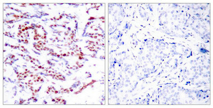 • Immunohistochemical analysis of paraffin-embedded human breast carcinoma tissue using ATF2(Phospho-Ser112 or 94) Antibody(left) or the same antibody preincubated with blocking peptide(right).