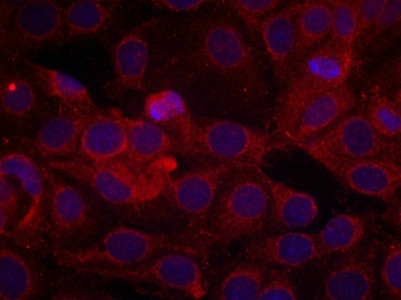Immunofluorescence staining of methanol-fixed MCF cells using VEGFR2(Phospho-Tyr1175) Antibody.