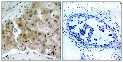 Immunohistochemical analysis of paraffin-embedded human breast carcinoma tissue using VEGFR2(Phospho-Tyr1175) Antibody(left) or the same antibody preincubated with blocking peptide(right).