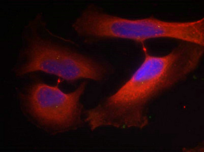 • Immunofluorescence staining of methanol-fixed Hela cells using Keratin 8(Phospho-Ser74) Antibody.