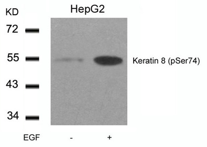 • Western blot analysis of extracts from HepG2 cells untreated or treated with EGF using Keratin 8(Phospho-Ser74) Antibody.
