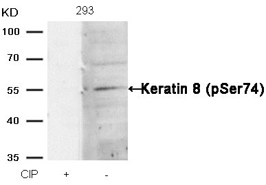 • Western blot analysis of extracts from 293 cells, treated with calf intestinal phosphatase (CIP), using Keratin 8 (Phospho-Ser74) Antibody.
