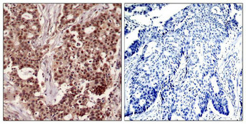 Immunohistochemical analysis of paraffin-embedded human breast carcinoma tissue using NFkB-p105(Phospho-Ser927) Antibody(left) or the same antibody preincubated with blocking peptide(right).