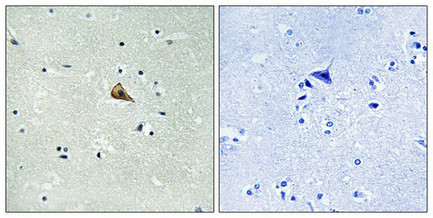 Immunohistochemistry analysis of paraffin-embedded human brain tissue using Trk A (Phospho-Tyr701) antibody. The picture on the right is treated with the synthesized peptide.