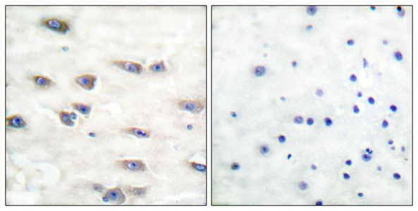 • Immunohistochemical analysis of paraffin-embedded human brain tissue, using Trk A (phospho-Tyr791) antibody (left)or the same antibody preincubated with blocking peptide (right).