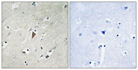 • Immunohistochemical analysis of paraffin-embedded human brain tissue using PDK1 (Phospho-Tyr9) antibody (left)or the same antibody preincubated with blocking peptide (right).