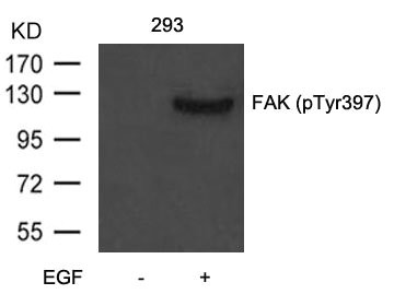 • Western blot analysis of extract from 293 cells untreated or treated with EGF using FAK(Phospho-Tyr397) Antibody using