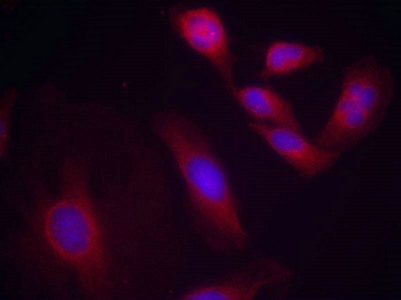 Immunofluorescence staining of methanol-fixed Hela cells using NFkB-p65(Phospho-Ser536) Antibody.