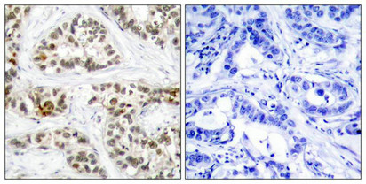 • Immunohistochemical analysis of paraffin-embedded human breast carcinoma tissue using RelB(Phospho-Ser573) Antibody(left) or the same antibody preincubated with blocking peptide(right).