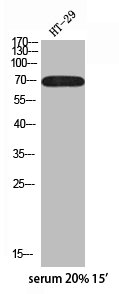 • Western blot analysis of HT-29 serum 20% 15' using p-p70 S6 kinase α (S418) antibody.