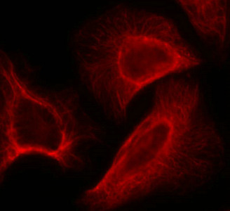 • Immunofluorescence staining of methanol-fixed Hela cells showing cytoplasmic, centrosomal and nuclear staining using p70 S6 Kinase(Phospho-Ser424) Antibody.
