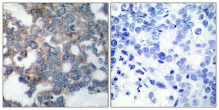 • Immunohistochemical analysis of paraffin-embedded human breast carcinoma tissue using p70 S6 Kinase(Phospho-Ser424) Antibody(left) or the same antibody preincubated with blocking peptide(right).