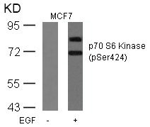 • Western blot analysis of extracts from MCF cells untreated or treated with EGF using p70 S6 Kinase(Phospho-Ser424) Antibody.
